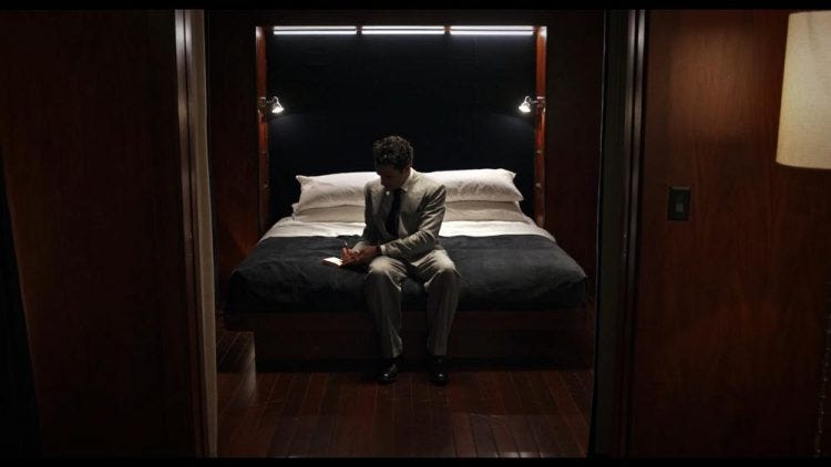 Reed meticulously plans a murder under the guise of a business trip. Director Nicholas Pesce — following up his black-and-white The Eyes of My Mother — does a phenomenal job evoking the very specific era in film. The shadowy cinematography by Zack Galler perfectly underscores the film's mysterious game of erotic cat-and-mouse.